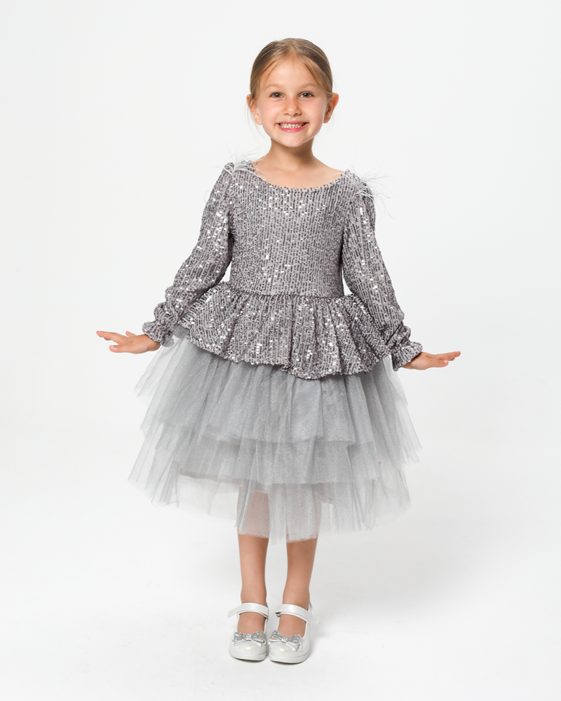 Kız Çocuk Payetli Tül Katlı Abiye Elbise Özel Gün ve Doğum Günü Gri