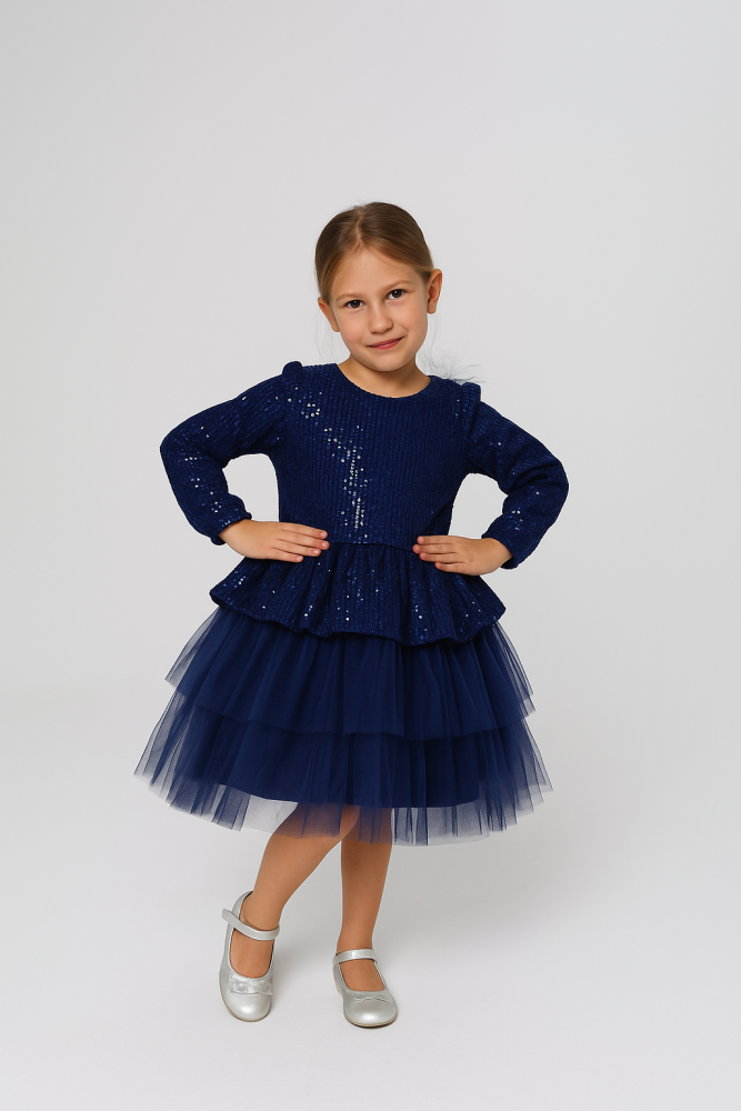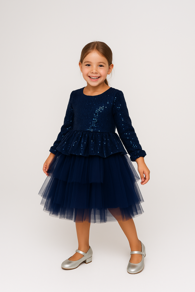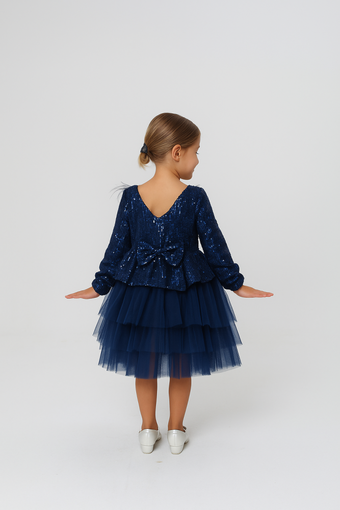 Kız Çocuk Payetli Tül Katlı Abiye Elbise Özel Gün ve Doğum Günü Lacivert