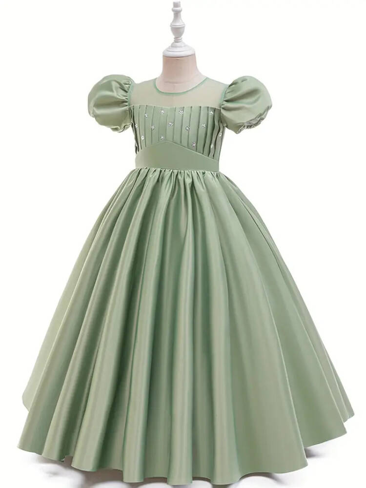 Kız çocukların özel günlerinde ve partilerde şıklığını tamamlayacak prenses abiye elbise.; - Uzun boyu ve A-line/kloş kalıbı ile zarif bir görünüm sunar.; - Dokuma kumaş tipi, dayanıklılığı ve konforu bir arada sağlar.; - Canlı yeşil rengi ile dikkat çekici bir stil oluşturur.; - Türk menşeli üretim, kalite ve güvenilirlik açısından tercih sebebidir.; - Düğün ve nikah gibi özel ortamlarda ideal bir seçimdir.; - Fermuarlı kapama şekli kolay kullanım imkanı sunar.; - Bebe yaka detayı ile masum ve tatlı bir görünüm kazandırır.; - Kemersiz tasarımı, elbisenin sade ve şık durmasını sağlar.; - Balon kol tipi, hareket özgürlüğü sunarken aynı zamanda moda bir dokunuş katmaktadır.; - Kısa kol boyu, yaz aylarında serinlik ve rahatlık sağlar.;