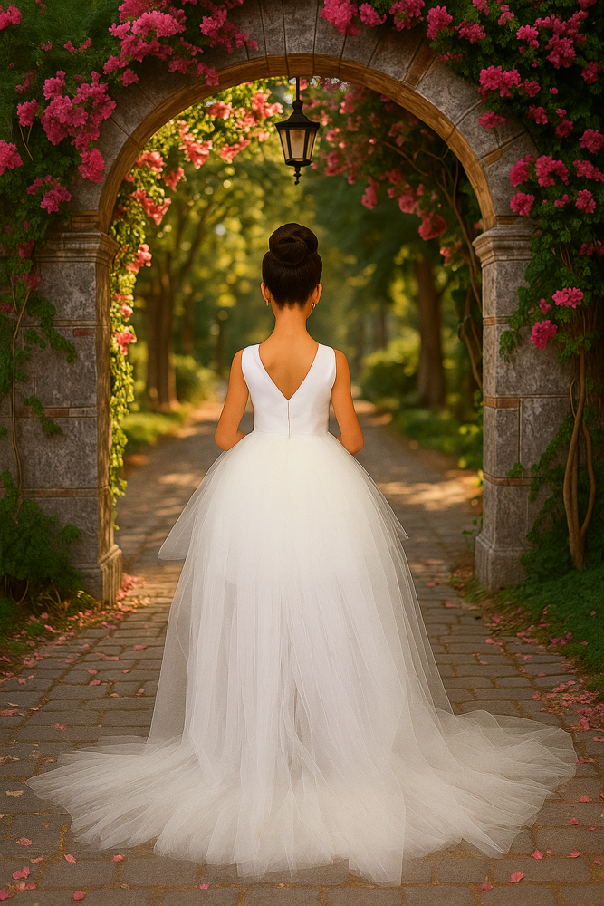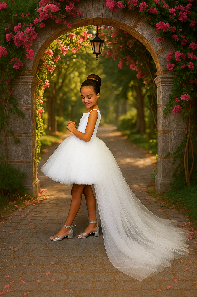 - Kız çocuklarına özel tasarlanmış, prenses havasını yansıtan tül kuyruklu elbise.; - Normal boy ölçüsüyle her yaş grubundaki kızların rahatça giyebileceği ideal uzunlukta.; - Siyah renk seçeneği ile şıklığı ve zarafeti ön plana çıkaran bir görünüm sunar.; - Asimetrik kalıbı sayesinde modern ve trend bir siluet oluşturur.; - Dokuma kumaşı, dayanıklılığı ve konforu bir arada sunarak uzun süreli kullanım imkanı sağlar.; - Fermuarlı kapama şekli pratik kullanım kolaylığı sağlar; hızlıca giyilip çıkarılabilir.; - Aksesuar detayları ile zenginleştirilmiş tasarım, göz alıcı bir stil vurgusu yapar.; - Bebe yakasıyla masalsı bir dokunuş eklerken aynı zamanda rahatlık sunar.; - Astarlı yapısı sayesinde iç göstermez ve ekstra koruma sağlar.; - Düz deseniyle sadelikten yana olanların tercihi olacak şekilde tasarlanmıştır.; - Türkiye menşeli olmasıyla yerel üretim avantajlarından faydalanır.; - Hem gündüz hem de gece etkinlikleri için uygun ortamlara adapte edilebilir.;