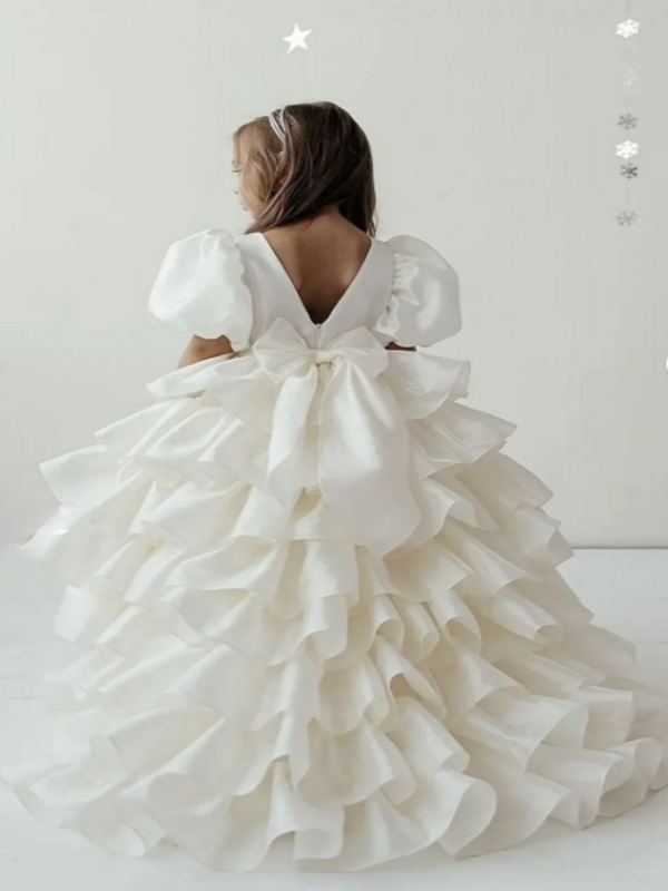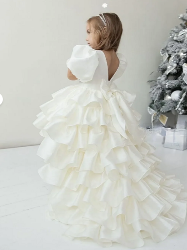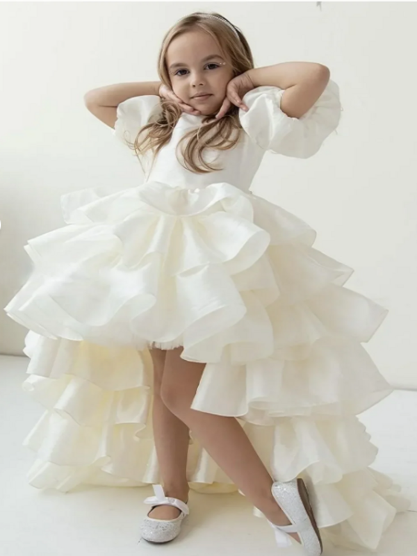 3-15 yaş aralığındaki kız çocukları için ideal, kırık beyaz renkteki bu saten abiye elbise, özel günlerde şıklığı ve rahatlığı bir arada sunar.; - Dokuma kumaş yapısı ile dayanıklılık ve konforu bir arada yaşatır; uzun süreli kullanımlarda bile formunu korur.; - TR menşeli olmasıyla yerel üretim kalitesini ve güvenilirliğini temsil eder.; - Asimetrik kalıbı sayesinde modern ve trend bir görünüm kazandırırken, bebe yaka detayı ile masumiyeti ön plana çıkarır.; - Astarlı yapısı sayesinde hem şık hem de rahat bir kullanım sunarken, kısa balon kolları ile hareket özgürlüğü sağlar.; - Kemersiz tasarımı ile sade ve zarif bir duruş sergilerken, fermuarlı kapama şekli pratik giyinme imkanı tanır.; - Saten materyaliyle lüks bir dokunuş ekler ve ışığı mükemmel şekilde yansıtarak göz alıcı bir parlaklık kazandırır.; - Düz deseniyle zamansız bir stil sunarken, her türlü aksesuarla kolayca kombinlenebilir.;