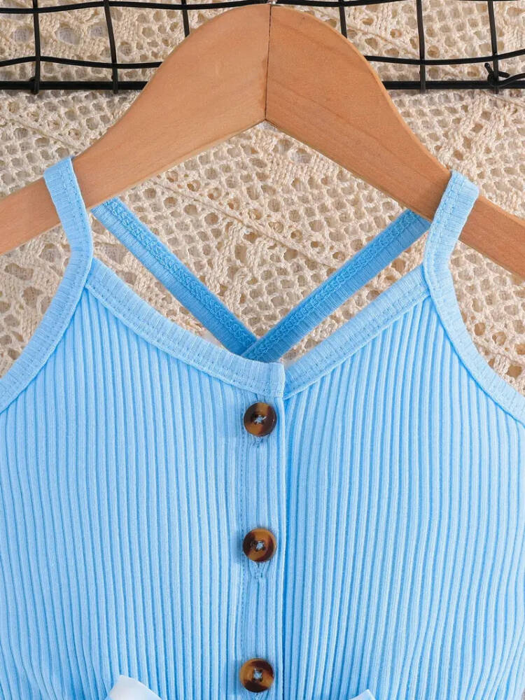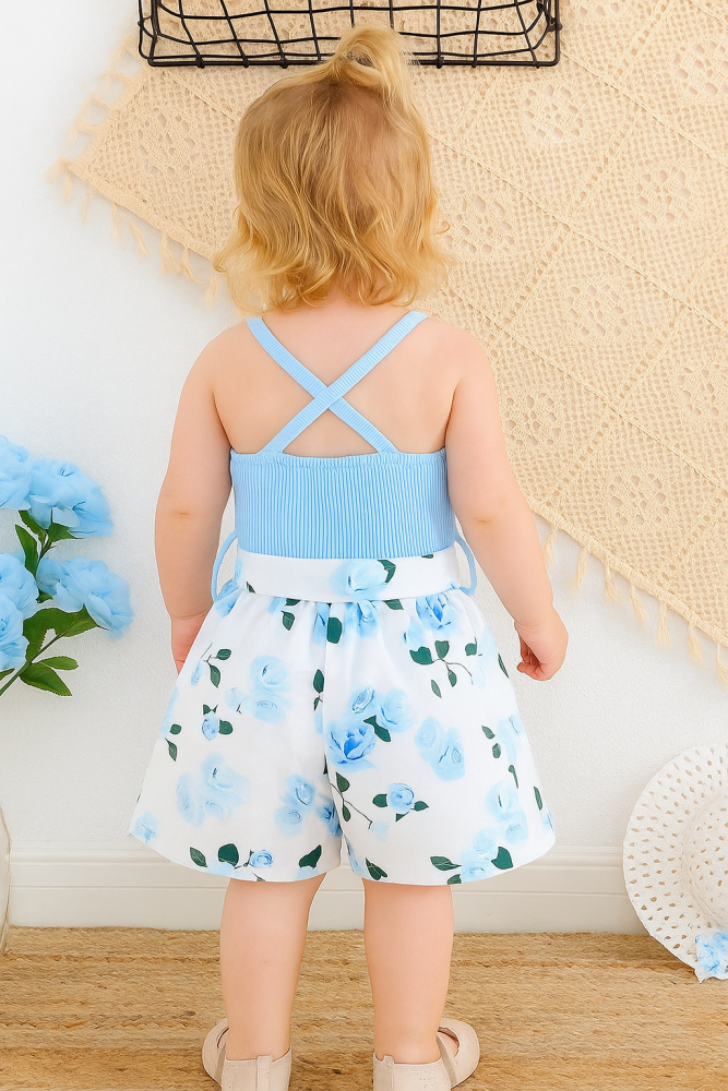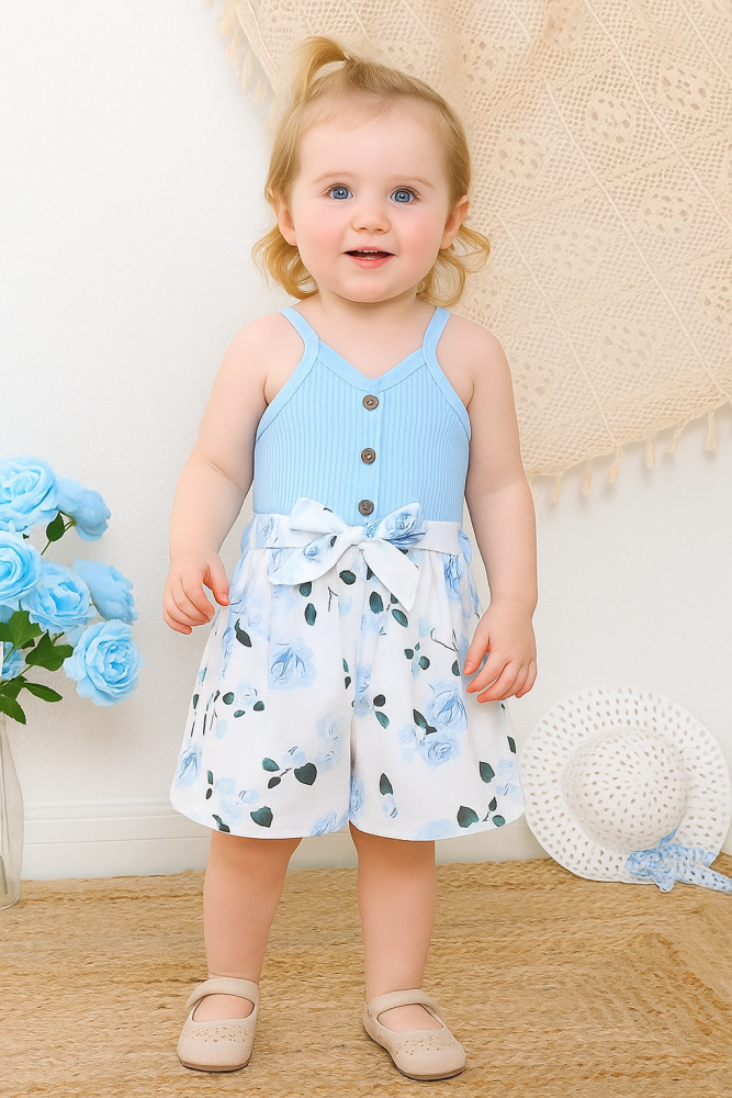 - 3-11 yaş arası kız çocukları için ideal, rahat ve şık bir yazlık tulum.; - Canlı mavi ve beyaz çiçek desenleriyle göz alıcı bir görünüm sunar.; - Askılı tasarımı sayesinde serin yaz günlerinde konforlu bir kullanım sağlar.; - V yaka kesimi ile zarif bir boyun hattı vurgular.; - Beli lastikli yapısı sayesinde mükemmel uyumu ve rahatlığı garanti eder.; - Düz paça tasarımı, hareket özgürlüğü sunarken şık bir siluet oluşturur.; - Kuşak detayı ile bel bölgesini zarifçe sararak feminen bir dokunuş katıyor.; - Dokuma kumaşı dayanıklılığı artırırken, hafif yapısıyla yaz sıcağında ferahlık sunar.; - Gündüzden geceye her ortamda rahatça tercih edilebilen çok yönlülükte bir parça.; - TR menşei ile yerli üretim kalitesini ve güvenilirliğini temsil eder.;