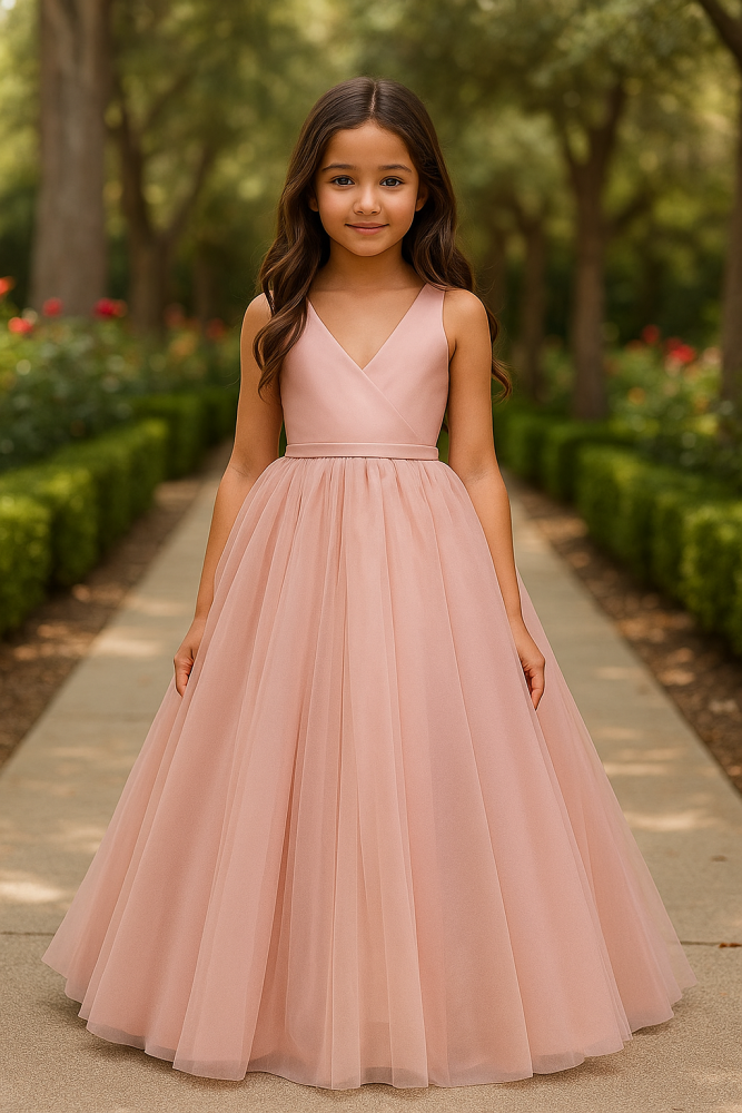 - Prenses modeli, kız çocukların hayallerindeki elbise tasarımıyla öne çıkar.; - Pudra rengi ve pembe web rengi seçenekleriyle her ortamda dikkat çekici bir görünüm sunar.; - Hafif ve zarif tül materyali, hareket özgürlüğü sağlarken şıklığı da beraberinde getirir.; - Kruvaze yaka tipi ile asil ve sofistike bir duruş sergiler.; - Uzun boyu sayesinde zarif bir siluet oluştururken, kolsuz tasarımı yaz aylarında serinlik sağlar.; - Cepsiz tasarımı ile sade ve minimalist bir görünüm sunar.; - A-line / kloş kalıbı ile vücut hatlarını nazikçe sararak feminen bir siluet oluşturur.; - Astarlı yapısı konforlu bir kullanım vaat ederken, fiyonklu detaylarıyla prenses konseptine uygunluk sağlar.; - Fermuarlı kapama şekli pratik kullanım imkanı sunarken, kutulu gönderimi sayesinde ürünün zarar görmeden teslim edilmesini garanti eder.; - Düz deseniyle zamansız bir şıklık kazandırırken, dokuma tipi tül kumaşıyla hafif