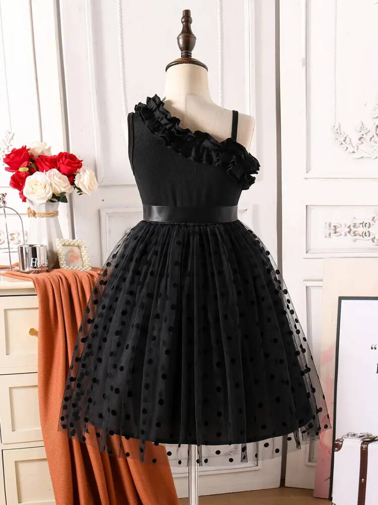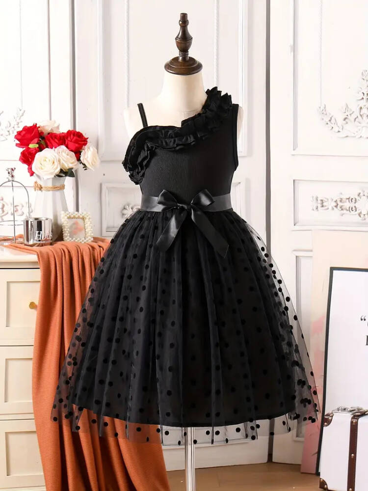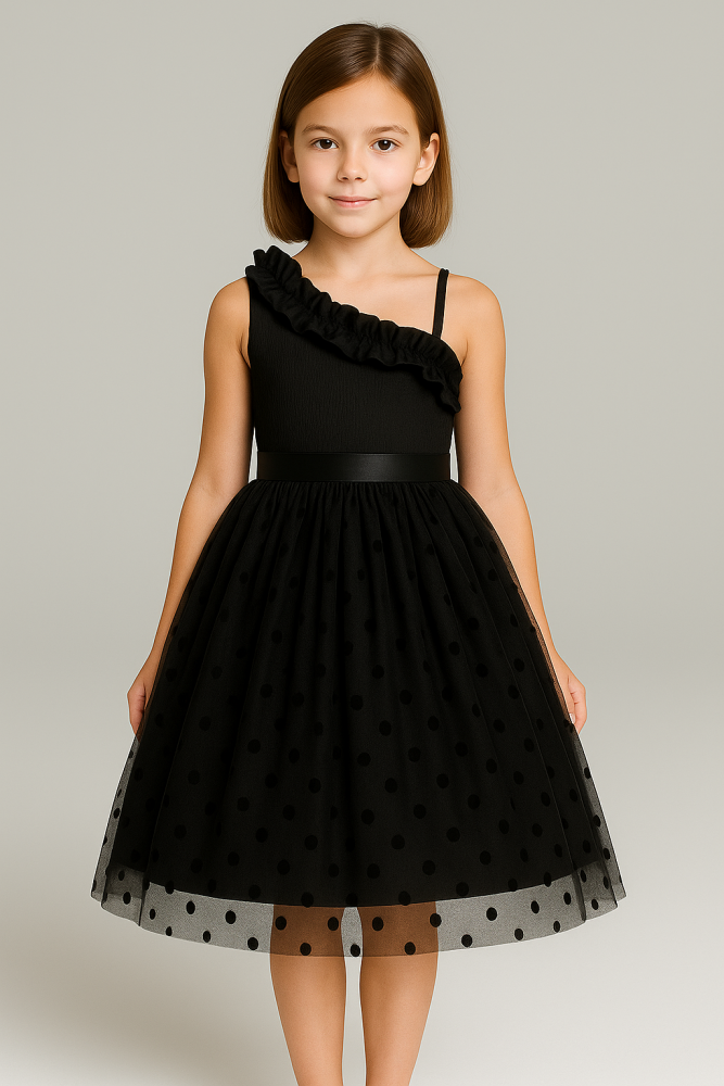 - Siyah renkli tül abiye elbise, özel günlerde kız çocuklarınızın şıklığını ön plana çıkarır.; - Kemersiz tasarımı ile sade ve zarif bir görünüm sunar.; - Tek omuz yaka detayı, modern ve şık bir stil oluşturur.; - Saten dokuma tipi sayesinde yumuşak dokunuşu ve parlak yüzeyiyle dikkat çeker.; - Düz kesimiyle rahat hareket etme imkanı sağlar.; - Beli lastikli yapısı sayesinde konforlu bir kullanım sunar.; - Eteği fırfırlı silueti ile hareketli ve dinamik bir görünüm kazandırır.; - Tek kol tasarımı, rahatlık ve şıklığı bir arada sunar.; - Midi boyu ile hem günlük kullanım hem de özel davetlerde idealdir.; - Cepsiz yapısıyla minimalist tasarımın keyfini çıkarın.; - Type 2 yıkama talimatına uygun şekilde kolayca temizlenebilir.; - Puantiyeli deseniyle neşeli ve canlı bir stil oluşturur.; - Astarlı yapısı ile iç göstermez ve konforlu bir deneyim sağlar.; - TR menşei garantisiyle yerel üretim kalitesini deneyimleyin.; - A-line / kloş kalıbı sayesinde vücut hatlarını zarifçe sarar ve şık duruş sergiler.; - Sürdürülebilirlik detayları bulunmazken, dayanıklı materyali uzun süreli kullanım vaad eder.; - 7-15 yaş bedeniyle küçük prensesler için ideal uyumu yakalar.